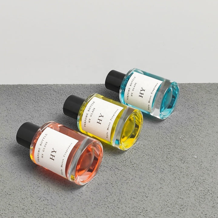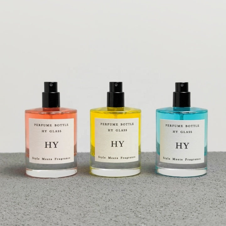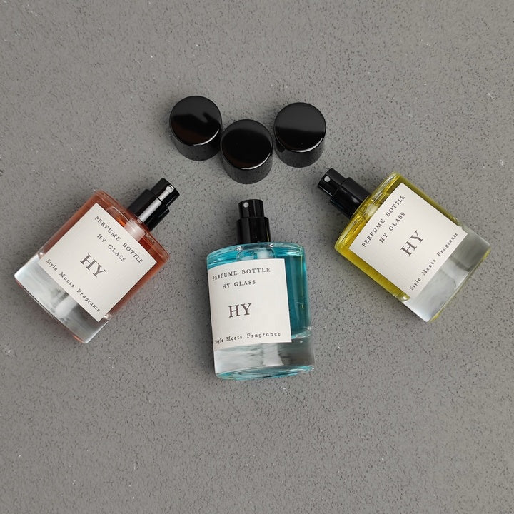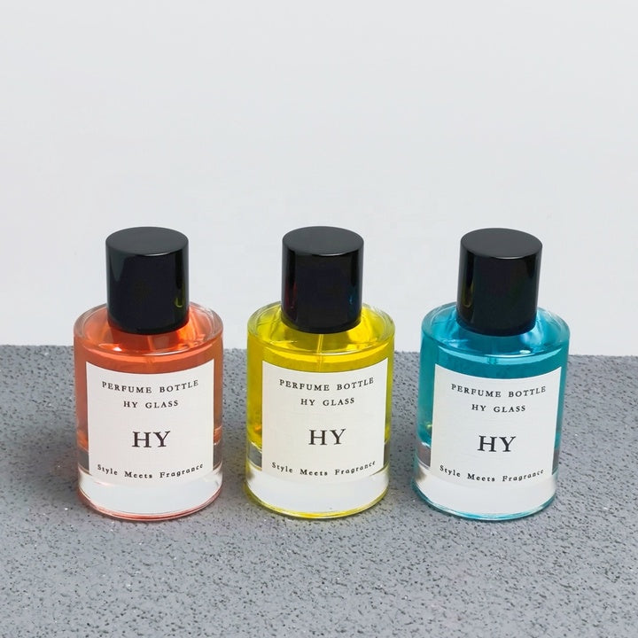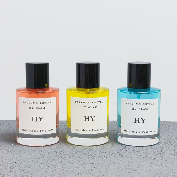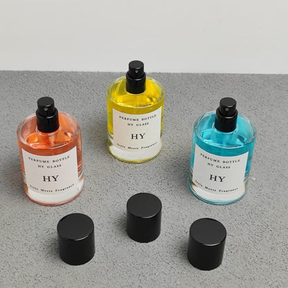 High Quality 50ml Minimalist Empty Glass Perfume Spray Bottle Crimp Neck and Black Cap with Pump Sealer
