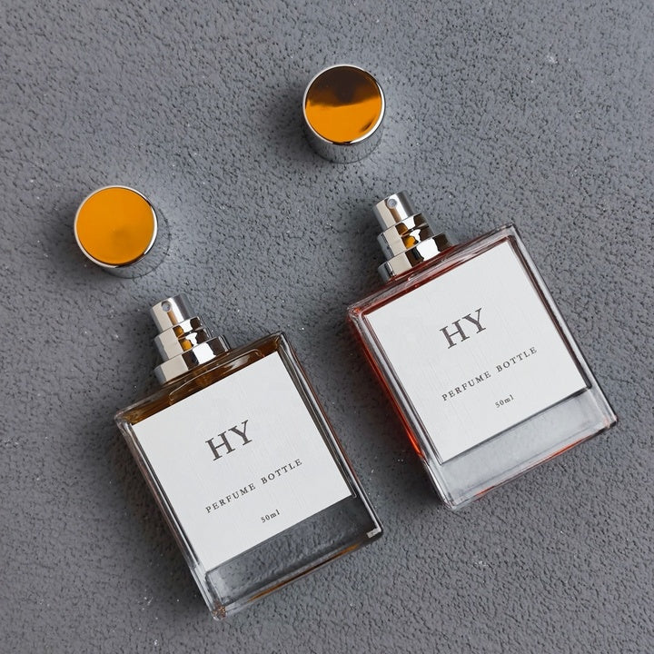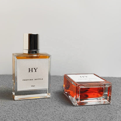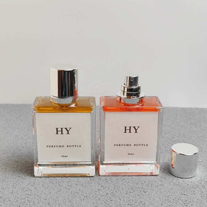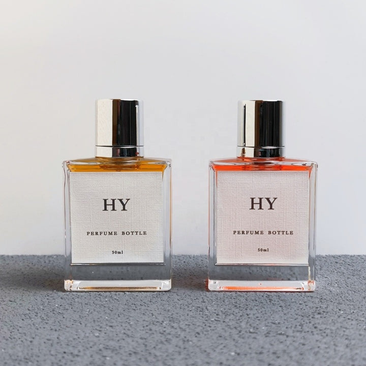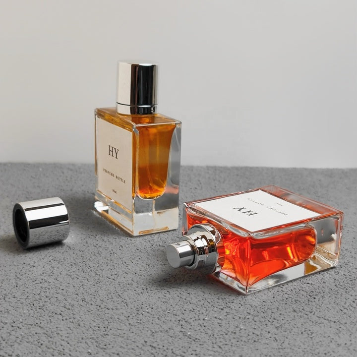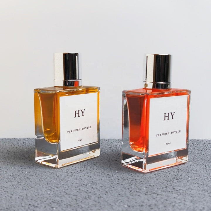 Low MOQ Luxury Thick Transparent Glass 50ml Flat Square Perfume Bottle with Silver Cap for High-End Fragrance Oil Packaging