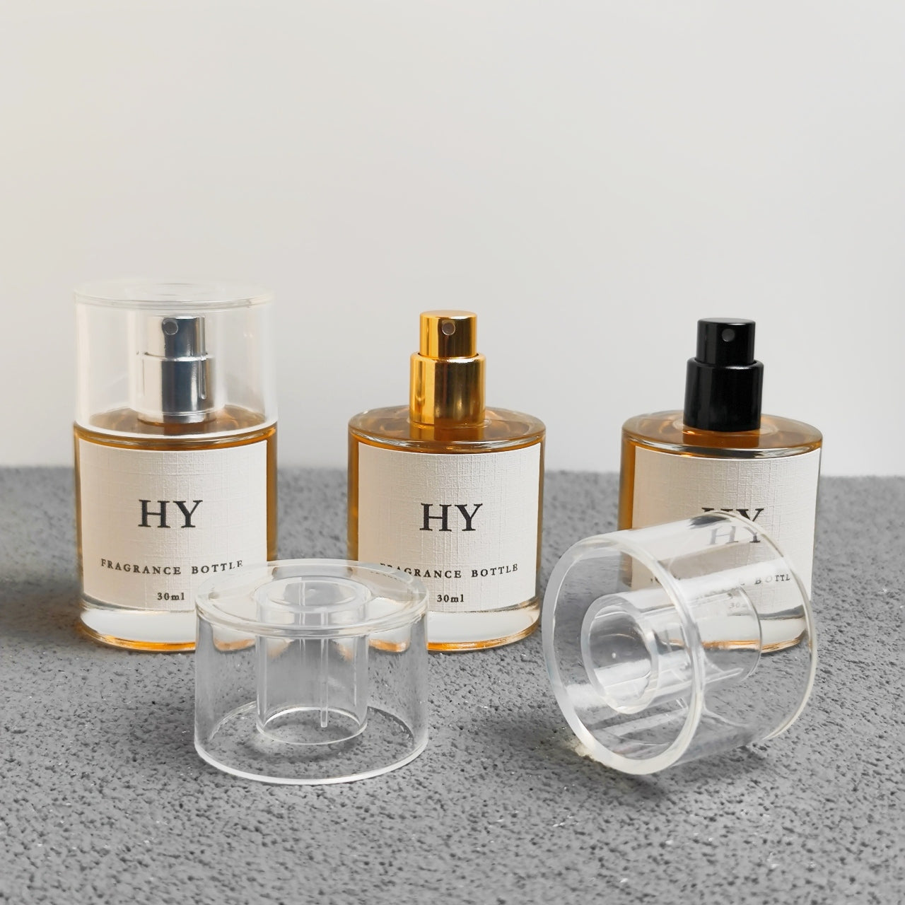 Luxury 30ml Easy Crimp Empty Cylinder Clear Glass Perfume Spray Bottle with Transparent Cylindrical Cap