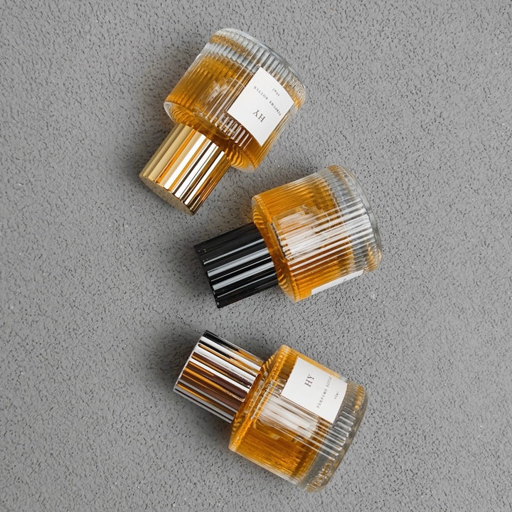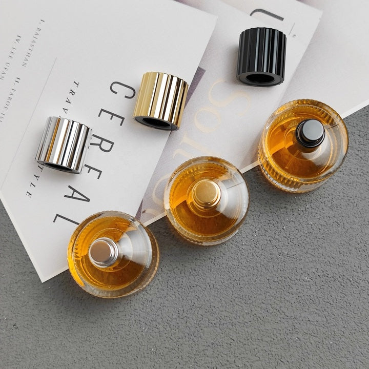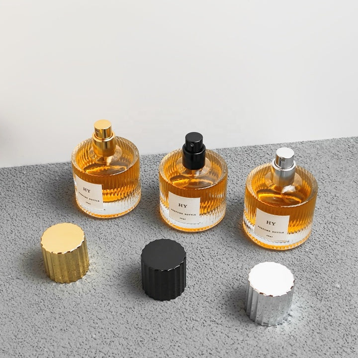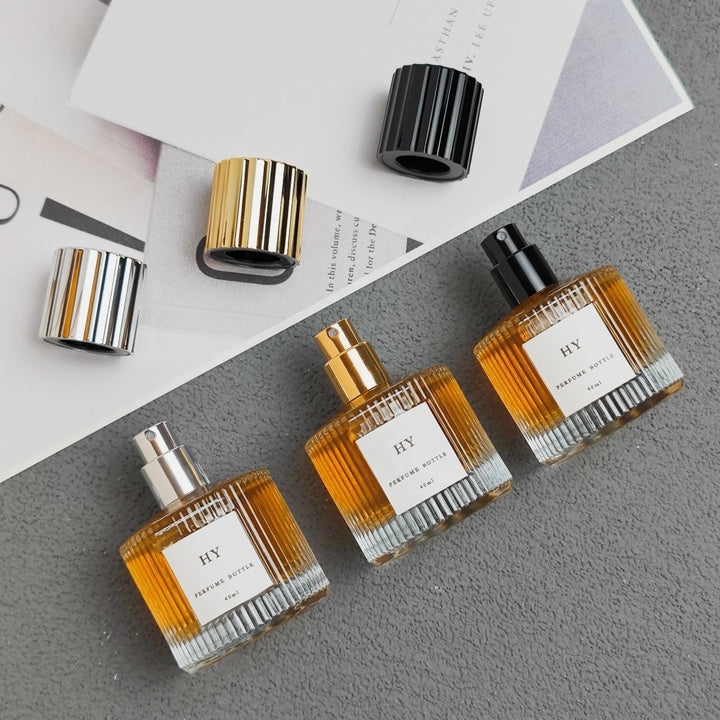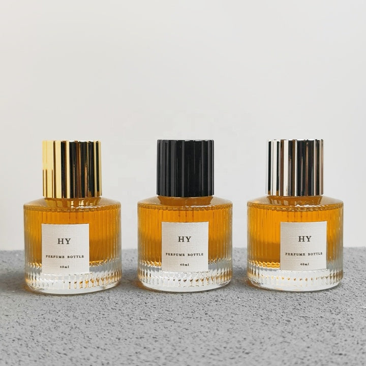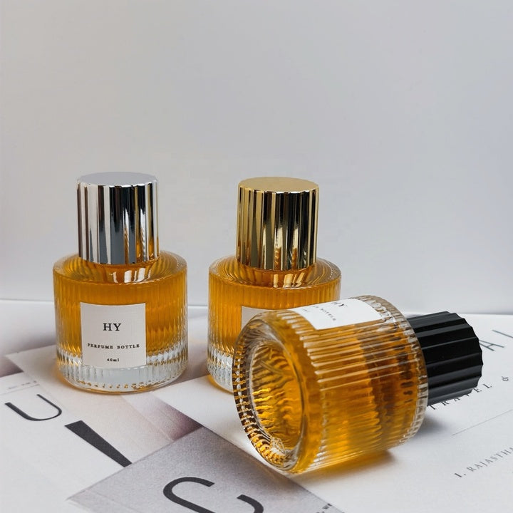 Recyclable Empty 40ml Stripe Short Cylinder Glass Atomizer Perfume Bottle with Ribbed Gold/Silver/Black Cap