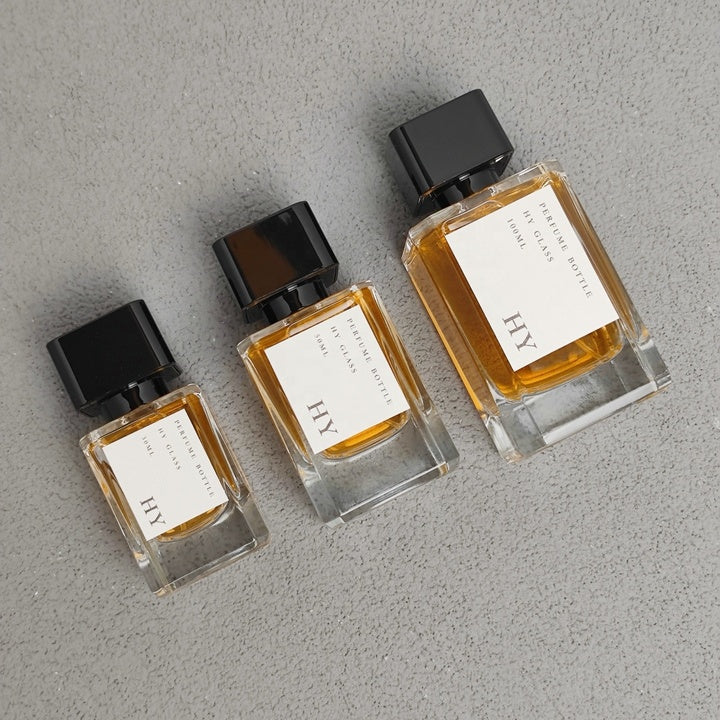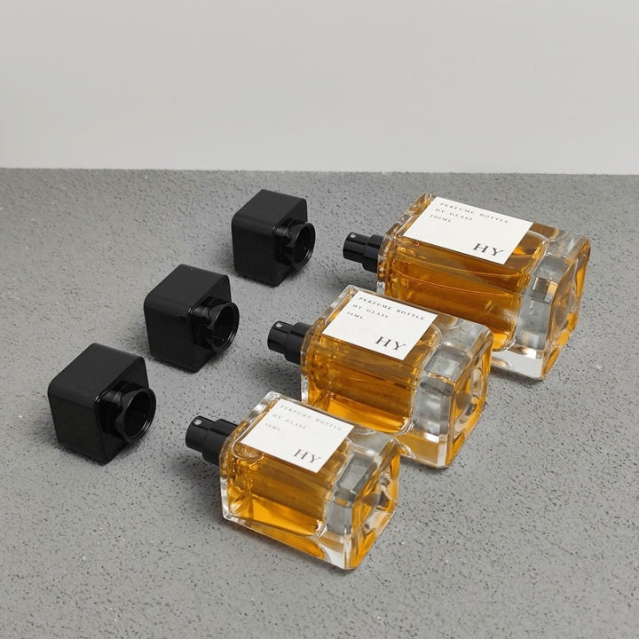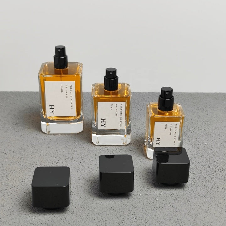 Wholesale Luxury Square Glass Perfume Bottles 30ml 50ml 100ml Empty with Black Square Cap & Pump Spreayer