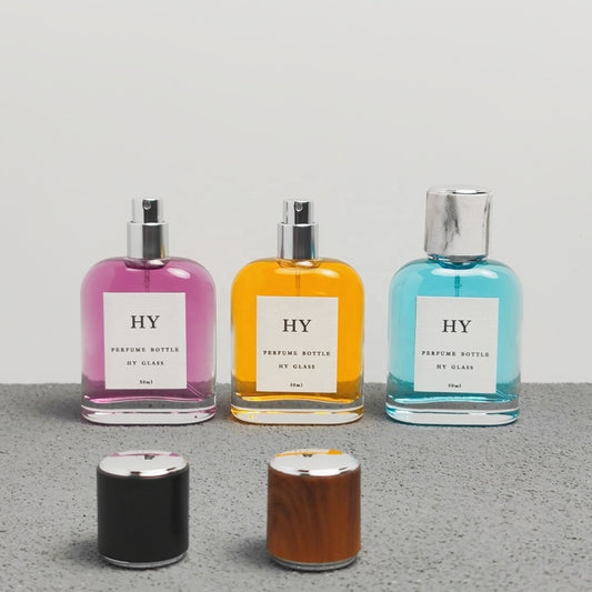 Premium 50ml Flat Easy Crimp Perfume Bottle with Luxury Round Wood Marble Textured Cap Pump Sprayer Seal Cute Design