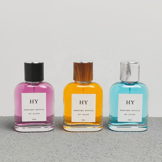Low MOQ Luxury Thick Transparent Glass 50ml Flat Square Perfume Bottle with Silver Cap for High-End Fragrance Oil Packaging