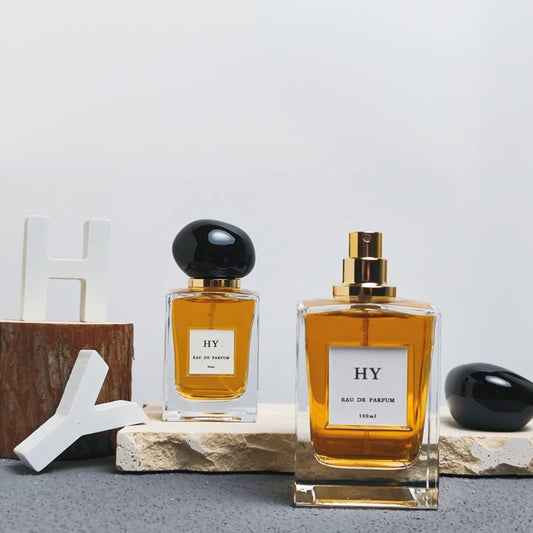 Ready to Ship Luxury 50ml 100ml Crimp Square Glass Perfume Bottle Black Stone Shape Cap with Pump Sprayer Wholesale