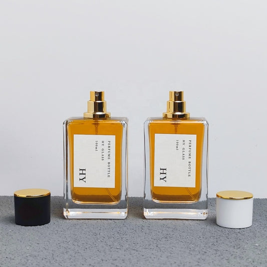 Wholesale 100ml Simple Thick Rectangle Glass Perfume Bottle with Gold Top and Black/White Round Cap Pump Sprayer Sealing Type