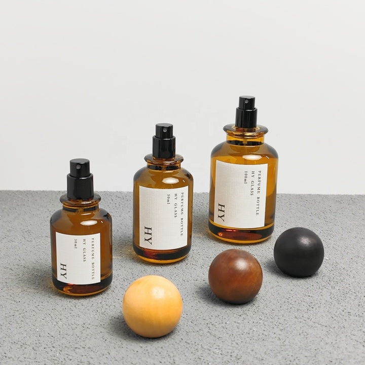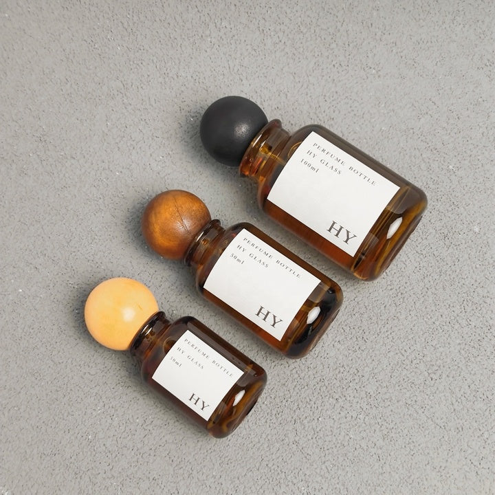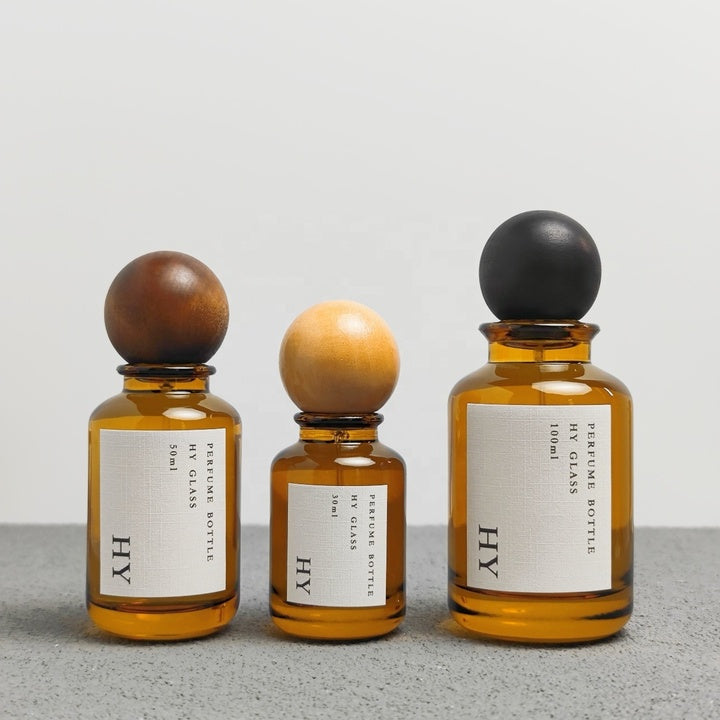 High Quality 30ml 50ml 100ml Crimp Neck Amber Perfume Bottles with Wooden for Ball Caps and Pump Sprayer Wholesale