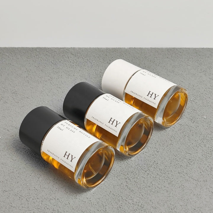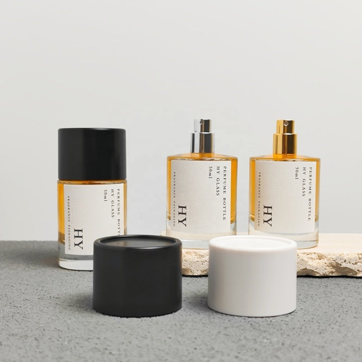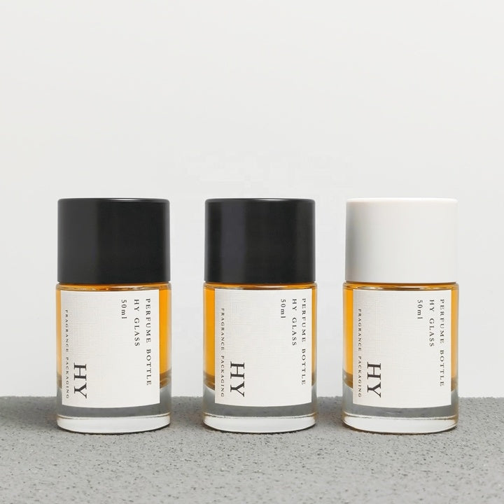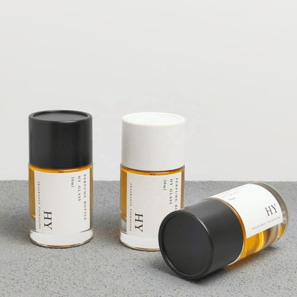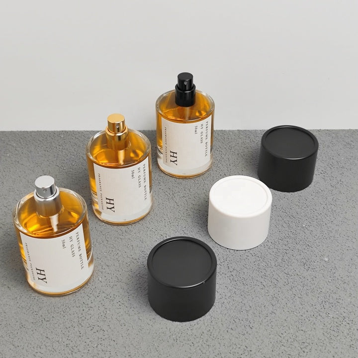 High Quality 50ml Crimp Neck Cylinder Glass Perfume Bottle Minimalist Black and White Cylindrical Cap with Pump Sprayer