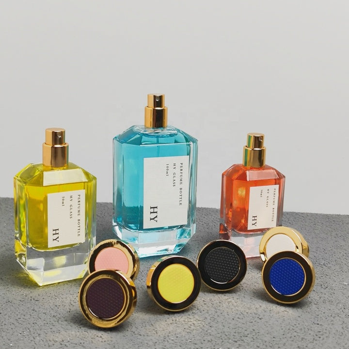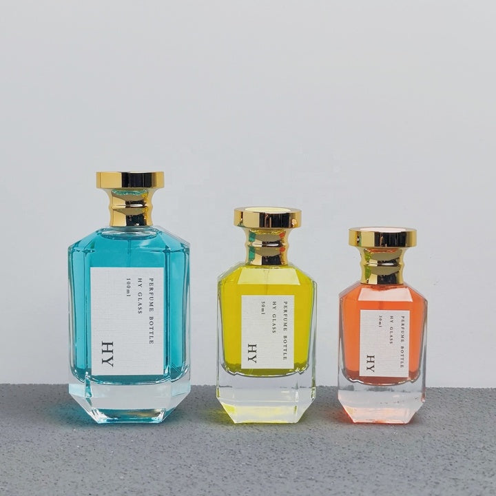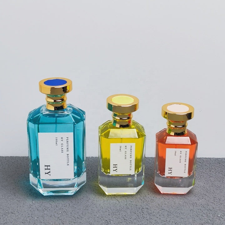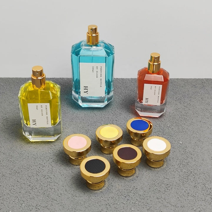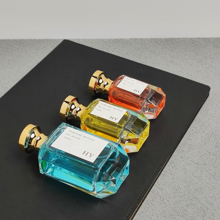 Luxury Niche Perfume Bottles Unique Polygon Design 30ml 50ml 100ml Glass with Gold Spray and Round Cap Colorful Top