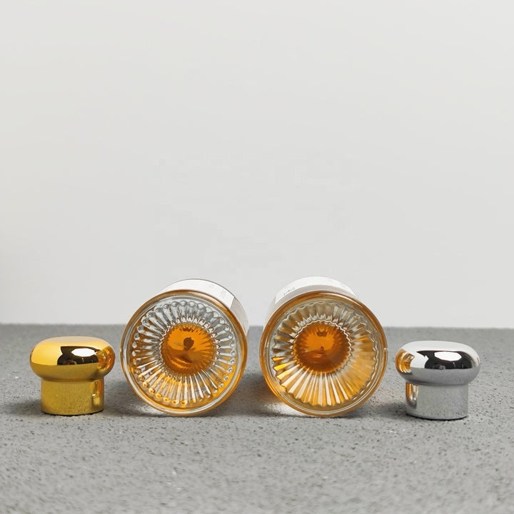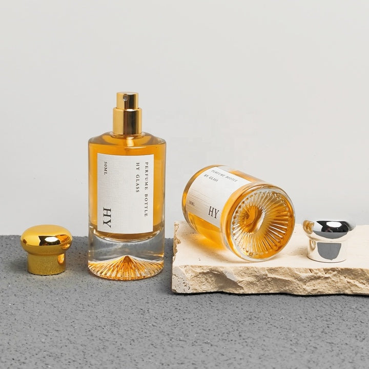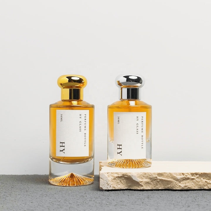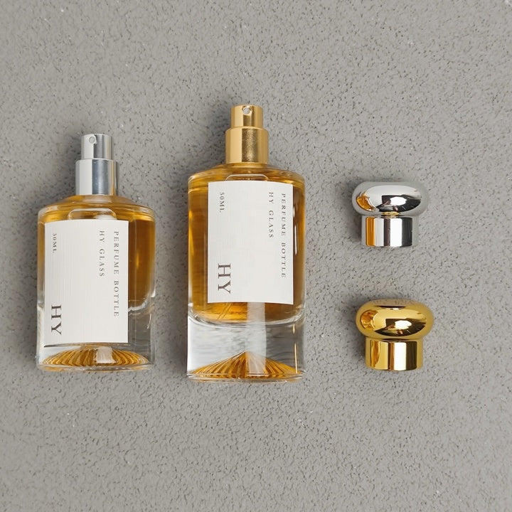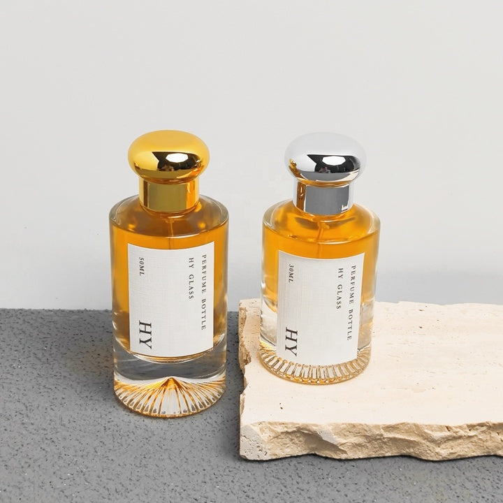 Luxury Radiating Base Cylinder 30ml 50ml Heavy Clear Glass Perfume Spray Bottle with Cute Gold Silver Cap